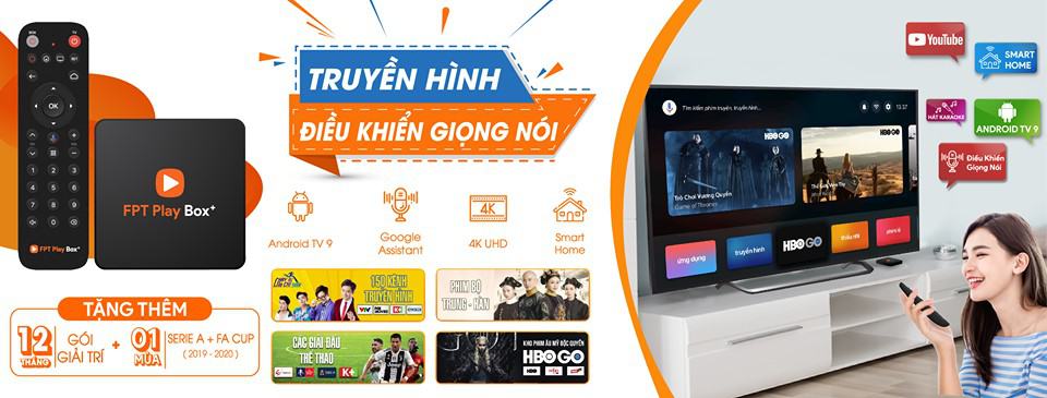 Tận hưởng mọi nội dung giải trí không giới hạn với thiết bị truyền hình điều khiển giọng nói FPT Play Box+ và trở thành một trong những người đầu tiên trải nghiệm gói HBO GO lần đầu ra mắt tại Việt Nam ngay hôm nay TẶNG THÊM 12 tháng gói truyền hình Giải trí (hơn 150 kênh truyền hình trong nước và quốc tế đặc sắc) TẶNG THÊM Mùa giải Serie A + FA Cup (2019 -2020)